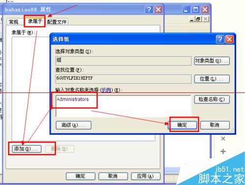 6、把hahaxiao88这个账号纳入管理员组,在属性窗口中,点击“隶属于”选项卡。删除users组,点击“添加”按钮,把Administrators组添加进来。最后点击确定-->应用--->确定。