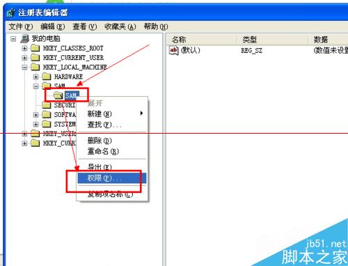 2、在SAM下面的子选项SAM上点击鼠标右键--->权限