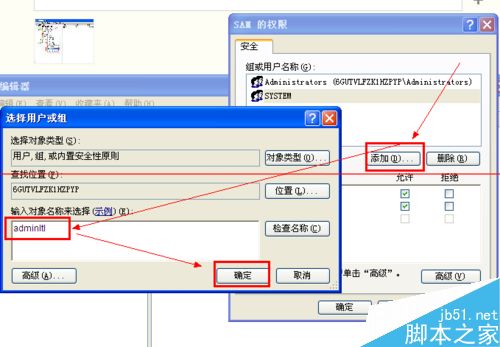 3、点击“添加”按钮,把当前登陆这台电脑的账户添加进“组/用户名称”里面去。我当前用户的名字是“adminltl”,然后输入adminltl后点击确定!