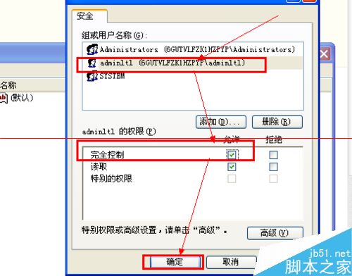 4、点中““组/用户名称”里面的当前的用户名字---->点击“完全控制后面的勾”。再单击“确定”按钮完成权限分配。最后按一下F5键,刷新注册表。
