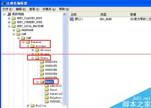 5、此时我们已经能展开SAM下面的选项的,再依次展开“Domains-->Account--->Users---->Names”。