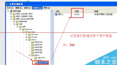 6、点击Names项中,我们新增的那个用户“hahaxiao88”。记住右侧的数值类型,如:3eb。