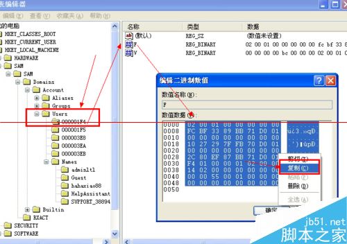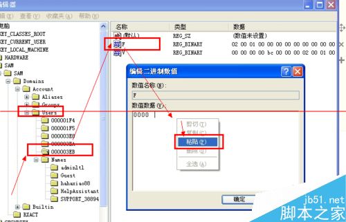 8、同样在“Users”项中找到含有“3EB”。使用鼠标左键点开它,双击F的值,打开后清空里面所有的数据,再把上面复制的数据粘贴到里面。再点击“确定”按钮。这样便把管理员的所有属性全部复制到“hahaxiao88”这个账户中来啦!