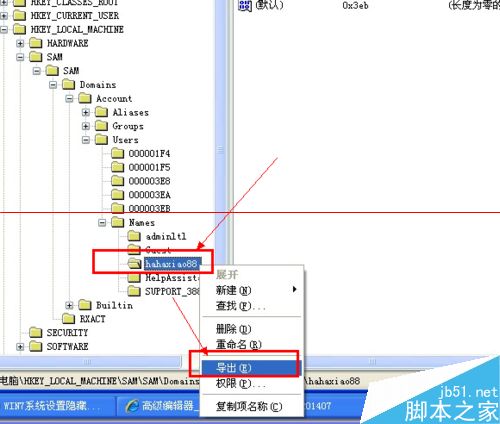 9、分别在含有“3EB”和“hahaxiao88”这两个项上面点击鼠标右键---->导出。我这里导出后生成的文件分别是一个a.reg,和一个b.reg。导出成功后关闭注册表。