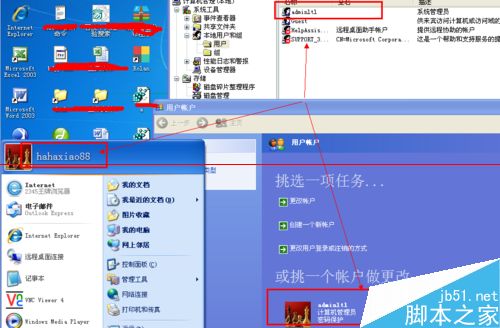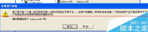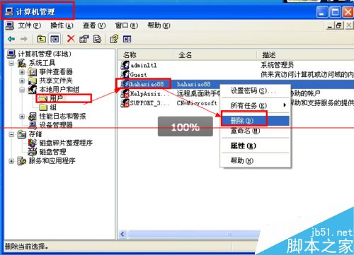 10、我们重新打开之前增加“hahaxiao88”账号的“计算机管理”窗口。然后在用户里面的“hahaxiao88”用户上点击鼠标右键--->删除--->是。