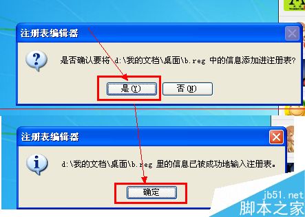 11、最后我们运行a与b.reg这两个我们之前导出的注册表文件,把“hahaxiao88”写入到注册表中去。双击a与b.reg后,依次点击“是”-->“确定”。