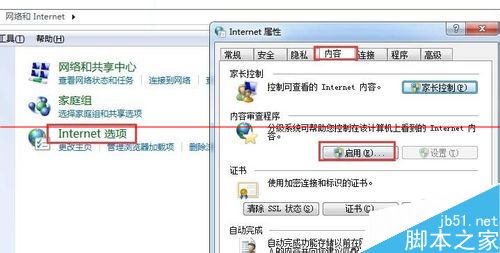 2、在打开的“控制面板”界面中找到Internet选项,切换到内容栏中,将分级审查启用,在弹出来的内容审查程序窗口中,点击确定按钮;