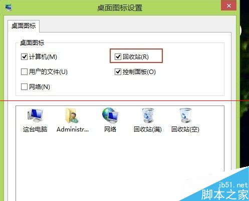 第三步,在弹出的"更改桌面图标"图标面板中勾选"回收站"然后点确认,桌面上就有回收站图标了。