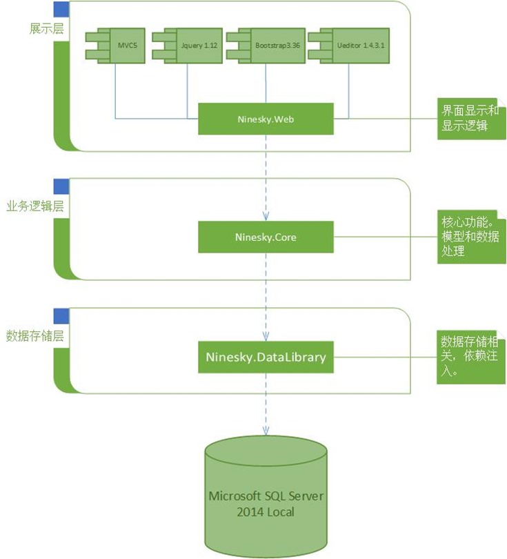 业务逻辑层主要负责业务的逻辑处理,由Ninesky.Core项目来实现,MVC 的Model在此项目中。Ninesky.Core项目通过调用Ninesky.DataLibrary实现对数据的操作,并向Ninesky.Web提供服务。