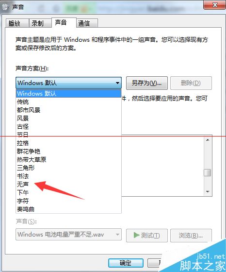 6、然后在【声音方案】选项里,找到【无声】点击选择,然后点击右下角应用,确定。