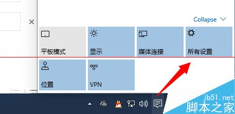 1、在任务栏的通知图标上点击一下,在出来的通知栏中点击【所有设置】
