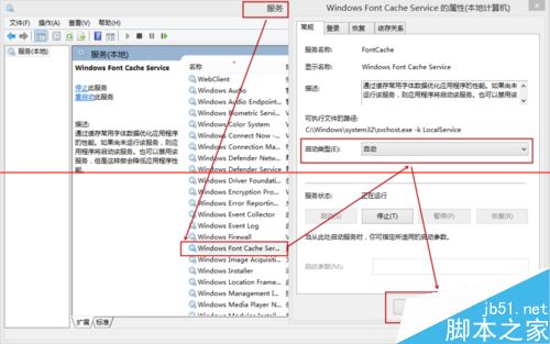 2、找到“windows font cache service”后,依照小编所给的下图一次设置【也就是把“windows font cache service”的启动类型改为“自动”】