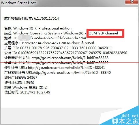 3、上述命令是显示:操作系统版本、部分产品密钥、许可证状态。如图,在“描述”中可以看到电脑的信息为OEM,是可以免费升级的。电脑授权方式中,OEM代表零售密钥、Retail代表零售密钥、VOLUME代表批量授权密钥。如果是VOLUME就不可以免费升级。