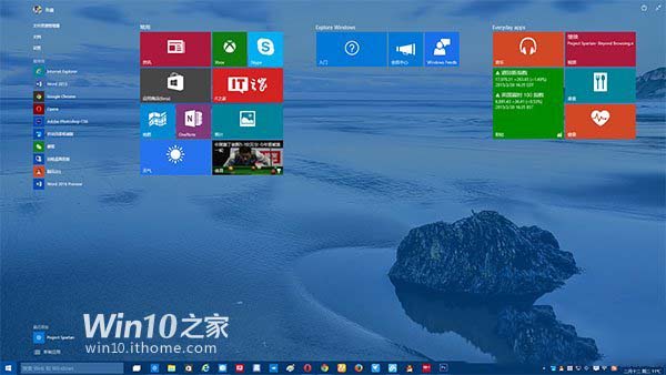 Win10预览版10041的开始屏幕 现在微软已经在Win10预览版10049中修复了该问题,以桌面为背景的透明效果显得更加清新。你可以根据自己的喜好换上合适的桌面壁纸来尝试“最养眼”的搭配。