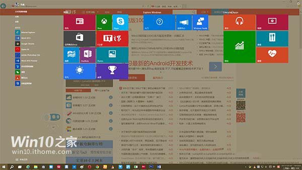Win10预览版10049的开始屏幕 按照微软的设计,开始屏幕状态下背景应该只能见到桌面壁纸,而不应该见到其他已有窗口。但在Windows10预览版10041中,由于开始屏幕和开始菜单支持透明效果,用户在使用开始屏幕或者平板模式的时候,会发现开始屏幕只是单纯覆盖在当前窗口之上,并没有根据微软要求只显示桌面壁纸。这样虽然不算难看,但会在一定程度上影响用户的使用体验,造成视觉困难。