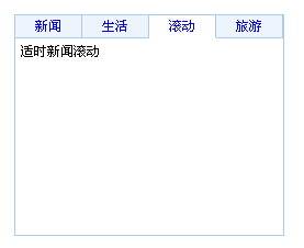 <!DOCTYPE html PUBLIC "-//W3C//DTD XHTML 1.0 Transitional//EN""http://www.w3.org/TR/xhtml1/DTD/xhtml1-transitional.dtd"><html xmlns="http://www.w3.org/1999/xhtml"><head><title>网页滑动门菜单</title><style>* {list-style-type:none; font-size:12px; text-decoration:none; margin:0; padding:0;}.tab{ margin:20px; width:244px; height:200px; overflow:hidden; border:1px #AACCEE solid;}.tab_b{ overflow:hidden; margin:5px; }.menu{overflow:hidden; }.menu li{ display:block; float:left; display: list-item; text-align:center; width:60px; background-color:#EDF4FC;line-height:20px; border-bottom:1px #AACCEE solid;border-right:1px #AACCEE solid; }.menu li a{ display:block;}.menu_d{border-bottom:1px #FFFFFF solid;background-color:#FFFFFF; }.tab ul li.aaa{background: #FFFFFF;border-bottom:0px #FFFFFF solid;}</style></head><body><script language="javascript">function tabs(n){var len = 4;for (var i = 1; i <= len; i++){document.getElementById("tab_a" + i).style.display = (i == n) ? "block" : "none";document.getElementById("tab_" + i).className = (i == n) ? "aaa" : "none";}}</script><div class="tab"><ul class="menu" id="menutitle"><li id="tab_1" class="aaa"><a href="javascript:void(0)" onclick="tabs("1");" >新闻</a></li><li id="tab_2" ><a href="javascript:void(0)" onmouseover="tabs("2");" >生活</a></li><li id="tab_3" ><a href="javascript:void(0)" onmouseover="tabs("3");" >滚动</a></li><li id="tab_4" ><a href="javascript:void(0)" onmouseover="tabs("4");" >旅游</a></li></ul><div class="tab_b" id="tab_a1" style="display:block;"> 国内国际新闻</div><div class="tab_b" id="tab_a2" style="display:none;">本土快乐生活</div><div class="tab_b" id="tab_a3" style="display:none;">适时新闻滚动</div><div class="tab_b" id="tab_a4" style="display:none;">期待完美假日</div></div></body></html>希望本文所述对大家的javascript程序设计有所帮助。