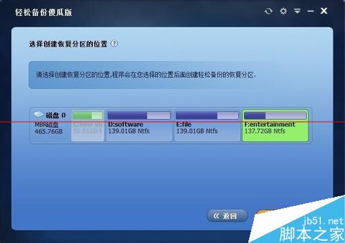 3、选择分区去储存系统镜像,并创造恢复分区。程序会自动检测电脑磁盘中年符合条件的分区,您只需要选择位置,选择好后,请点击“开始备份”。