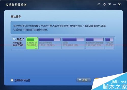 如果您想覆盖原来的系统,即还原到原来的C盘,则直接点击“开始还原”;如果您想还原到其他的位置,而不想还原覆盖原来的系统,可以勾选左下方的“还原到其他的位置”,然后选择C盘以外的分区,最后点击“开始备份”