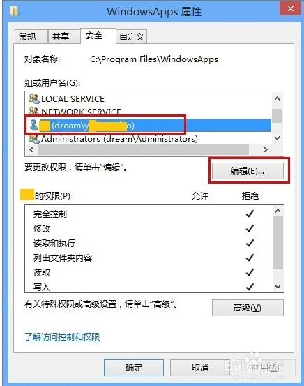 7.右击WindowsApps文件夹,选择属性,在WindowsApps属性窗口中,单击安全选项卡,选中当前用户,单击编辑;在弹出的安全窗口中,选中用户,勾选相应的权限,单击应用