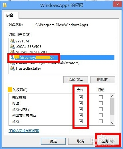 6.返回WindowsApps的高级安全设置,所有者已经更换,单击应用