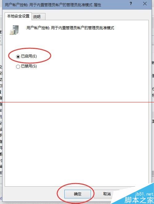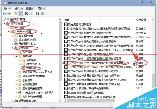 8、进去后,按图中顺序依次找到:用户账户控制:以管理员批准模式运行所有管理员,检查是否是未启用。