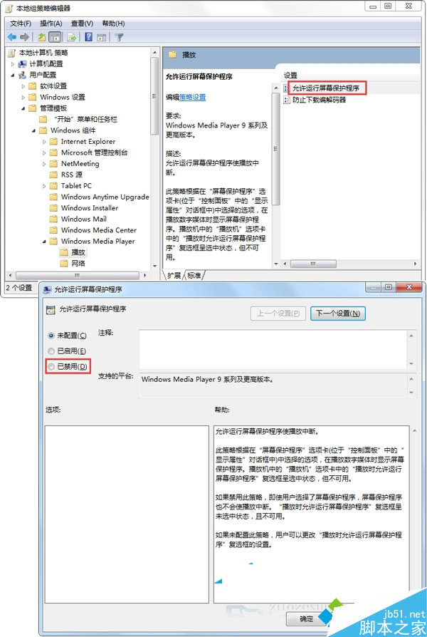 3、如上述操作打开电脑的组策略编辑器窗口,然后依次点击展开“用户配置”→“管理模板”→“Windows组件”→“WindowsMediaPlayer”→“播放”,然后双击右侧窗口中的允许运行屏幕保护程序,将状态设置为已禁用;