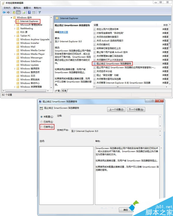 4、您依次展开“管理模板”→“Windows组件”→“Internet explorer”,然后将右侧窗口中的阻止绕过SmartScreen筛选器警告项禁用。