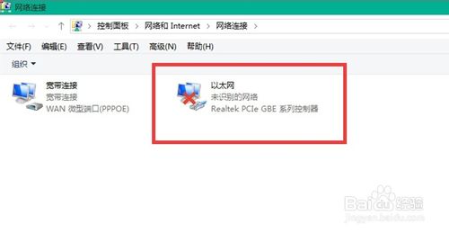 完成上一步之后,如果你的网络连接上了,那就万事大吉了,但是大部分情况下这样是很难连接上网络的,虽然我们的网络连接一般是宽带连接,但是有一个看起来好像没用的以太网,这时却起到举足轻重的地位,对它的正确设置又是 我们宽带连接的关键所在。下面我们就说说WIN10 10041版本上以太网的设置。打开网络和共享中心,在更改适配器设置中找到“以太网”图标。如图: