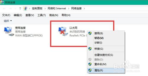 然后右键单击“以太网”图标,在对话框中点击属性,如图: