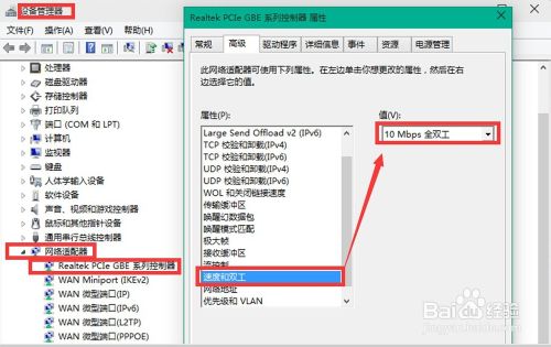 如果点击属性后,能正常弹出以太网的属性对话框的话,我们就在菜单栏的高级选项的下拉菜单中,点击“速度和双工”,再在右侧的数值框中选择“10Mbps全双工”,然后确定。如图所示: