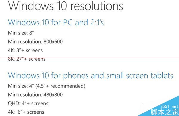 根据微软所演示的幻灯片,Windows 10 原生支持 4K 和 8K 分辨率。其中 4K 分辨率要求 PC 或 2 合 1 设备达到 8 英寸或更大尺寸,8K 分辨率则要求至少 27 英寸屏幕;而小尺寸设备如平板电脑和智能手机,4K 分辨率则要求 6 英寸或更大尺寸,此类别设备不支持 8K。