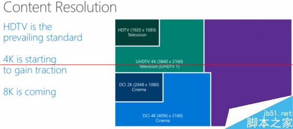 微软提到,Windows 10 操作系统原生提供 4K 视频编解码器 HEVC (High Efficiency Video Coding),也称为 H.265,联合国国际电信联盟目前主推的标准。比较遗憾的是,微软在其幻灯片中没有提到另一个不同的 4K 视频编码解码器 VP9,或许是因为该标准由谷歌与主流电视和芯片制造商定制的标准。