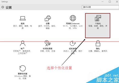 2、然后打开设置里右上方的个性化(这个设置里的个性化和桌面上右键的个性化是有很大区别的,并且桌面右键的个性化没有锁屏设置)。
