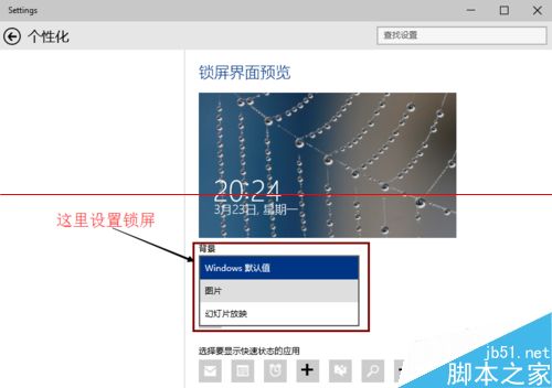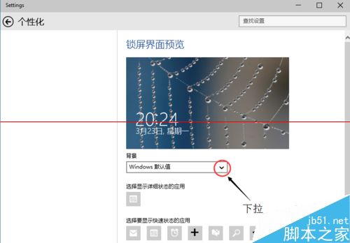 3、在个性化锁屏预览图片下方的背景里下拉就可以设置锁屏。