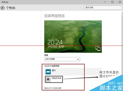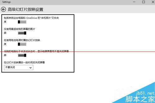 6、最后一个是幻灯片放映,我们可以选择一个放好我们喜欢的多张图片的文件夹,设置后我们的锁屏会将我们选中的文件夹里的图片用幻灯片的方式循环播放。当然高级幻灯片放映设置里我们可以设置锁屏与关闭屏幕时间等内容。