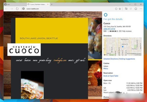 Project Spartan内置了Cortana,不过相对比较“安静”,只有在有相关信息时提示你,比如说访问餐厅的网站,Cortana会提示找到更多信息。也可以右键中Ask Cortana主动激活Cortana来查询。