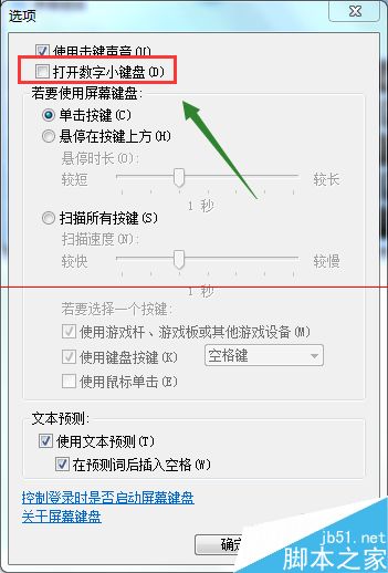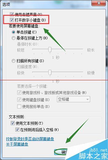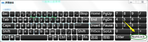 5、这个时候将该项点击勾选,然后确定退出,此时虚拟键盘右下角的NumLock键亮起,这个时候一般问题都可以解决,当然键盘硬件坏了的情况例外
