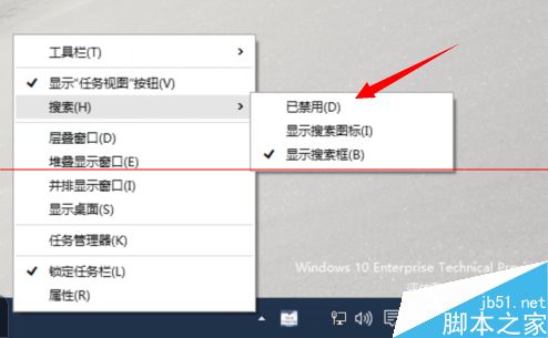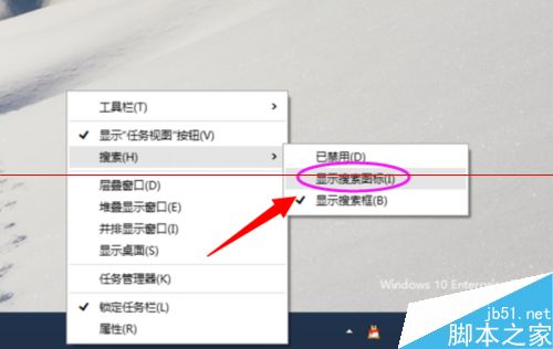 1、有任务栏那里点击一下右键,然后再点击【搜索】