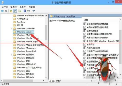 4、在本地组策略编辑器窗口中,依次点击“管理模板/Windows组件/Windows Installer”菜单项,在右侧找到“禁止用户安装”一项