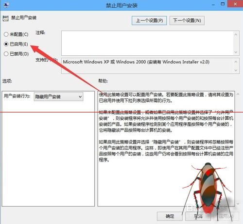 5、在打开的“禁止用户安装”窗口中,可以看到该项设置为“已启用”,这就是导致不能正常安装软件的原因。