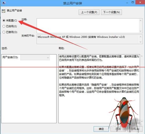 6、我们把该项设置为“未配置”或是“已禁用”,然后点击确定按钮保存退出,这样以后就可以正常安装软件了。
