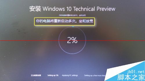 下载结束,系统重启,新的安装界面呈现在我们眼前。“坐和放宽”这样的机器英译中,我们领会精神就可以了;还不能坐的太“宽”,因为我们看得就是新安装界面和进程啊。