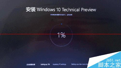 可以看到,整个安装步骤分为正在配置设置、Setting up、Applying PC settings、Setting up a few more things 四大部分。整个过程就是画圆圈、蹦数字,简单是简单了,就是有点闷;这个界面确实不是让人欣赏的,我们更应该坐并放“宽”。其实这种界面,明显是为了适应多种设备,即使到了手机的小屏幕上,也能适配显示。