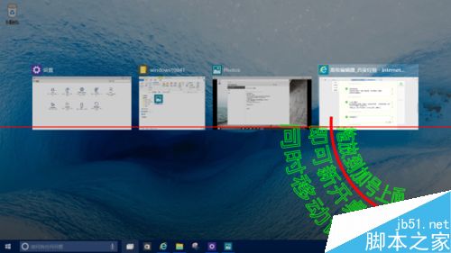 点击任务栏上的任务视图按钮,桌面缩略图的背景变成透明了(我又满意了一次);而且,用鼠标点击并拖动屏幕中间的应用程序窗口到右侧的“+”号上释放,即可新建一个虚拟桌面,并把刚才拖放的应用窗口移动到该桌面中。