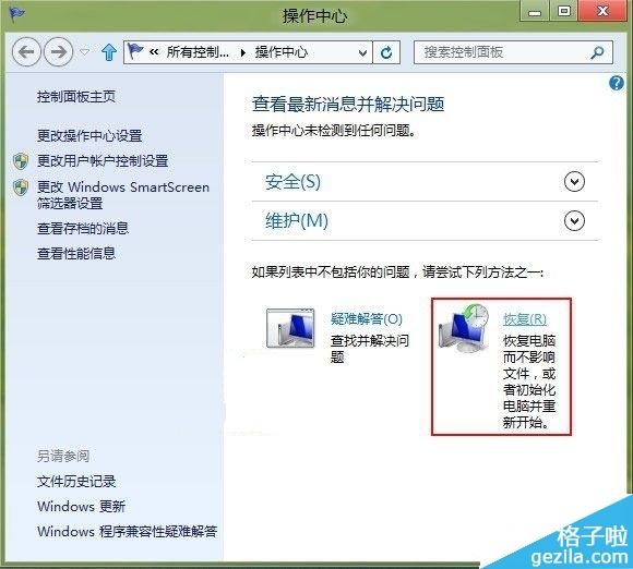 此时来到“操作中心”在下方可以看到“恢复”,如图中红框所指示!