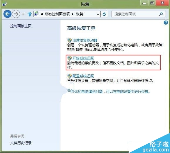 接下来进入“恢复”窗口,选择“高级恢复工具”中的“开始系统还原”。