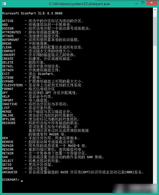 这些命令的使用方法可以在Diskpart命令提示符下键入Help或者通过网络查询,如果不清楚可以查看。