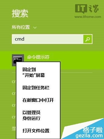 2、在搜索框中输入“cmd”,搜索并右击“命令提示符”,以管理员身份运行。