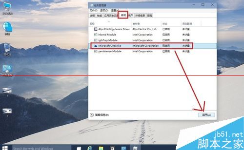 3、然后点击【启动】,找到里面的 Microsoft OneDrive一项,选中它,点击右下角的【禁用】。