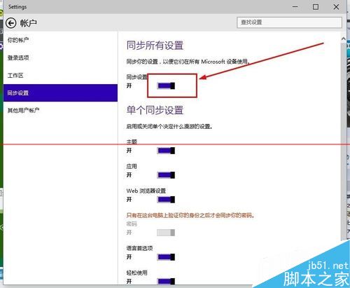 5、另一种方法,可以在开始菜单中的【settings】中的账户,关闭同步设置即可。